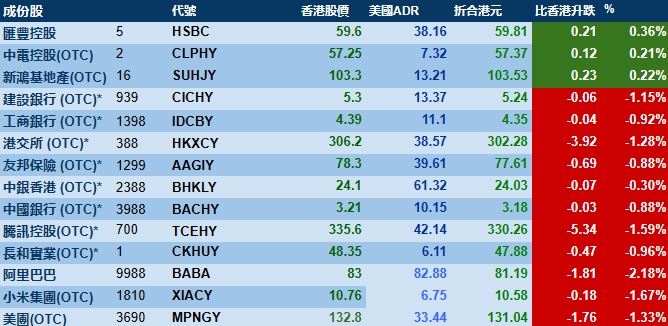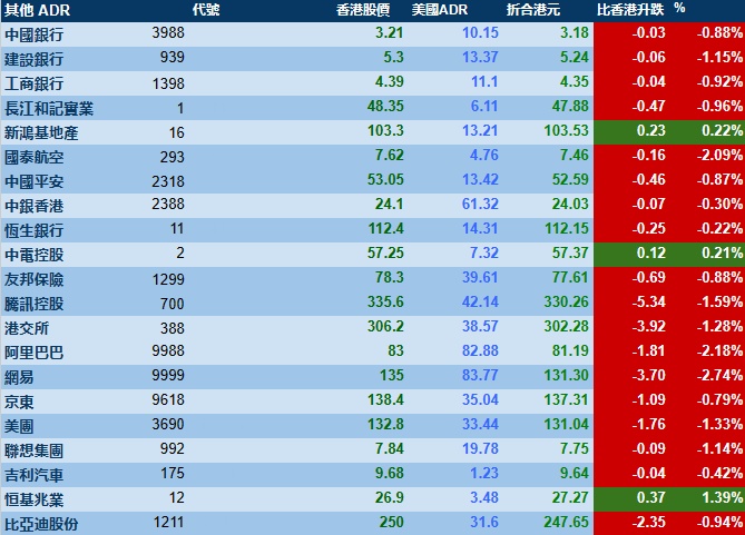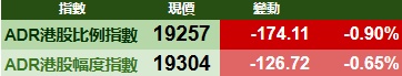 智通财经APP获悉,周二,美股三大指数集体收跌,港股ADR指数下跌,按比例计算,收报19257点,较香港收市跌174.11点或0.90%。