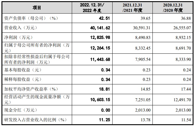 财务方面,于2020年度、2021年度及2022年度,公司实现营业收入分别约为2.66亿元、3.06亿元、4.01亿元。公司净利润分别约为8932.15万元、8490.83万元、1.28亿元人民币。