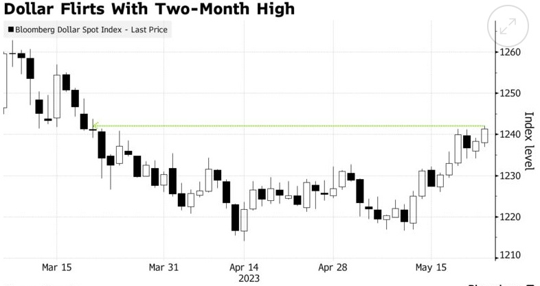 由于市场调整了对美联储降息时机的预期,衡量美元强弱的一项指标5月份迄今已上涨逾1%,债务上限僵局也增强了美元的避险吸引力。在此之前,美元已经贬值了两个月。