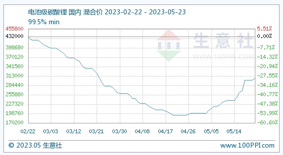 智通财经APP获悉,5月23日,青海某盐湖企业新一轮碳酸锂竞拍略显冷清,本轮竞拍碳酸锂共计32吨,起拍价为29.5万元/吨,仅一人出价,最终以起拍价成交。分析人士指出,此次拍卖只有一人出价,可能是因为拍卖规模较小;同时,目前市场观望心态较重,对于碳酸锂的价格走势拿不准。值得一提的是,年初一路下跌的碳酸锂价格在4月最低下探至18万元/吨后,便开始迅速反弹。5月23日,生意社电池级碳酸锂基准价为30.6万元/吨,与本月初(20万元/吨)相比,上涨了53.00%。