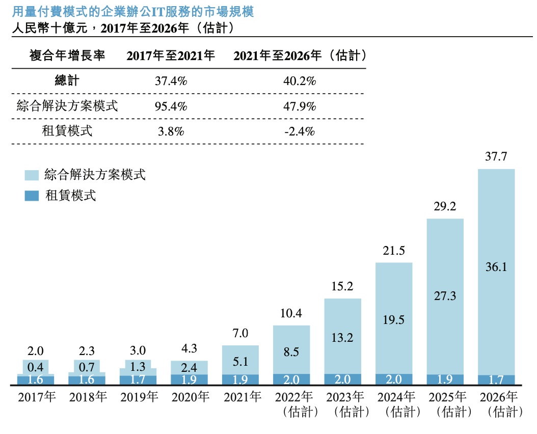 未来,办公IT综合解决方案分类将成为用量付费办公IT市场的重要增长引擎。据弗若斯特沙利文的资料,办公IT综合解决方案分类的市场规模由2017年的4亿元增长至2021年的51亿元,复合年增长率为95.4%,预计于2026年达到361亿元。