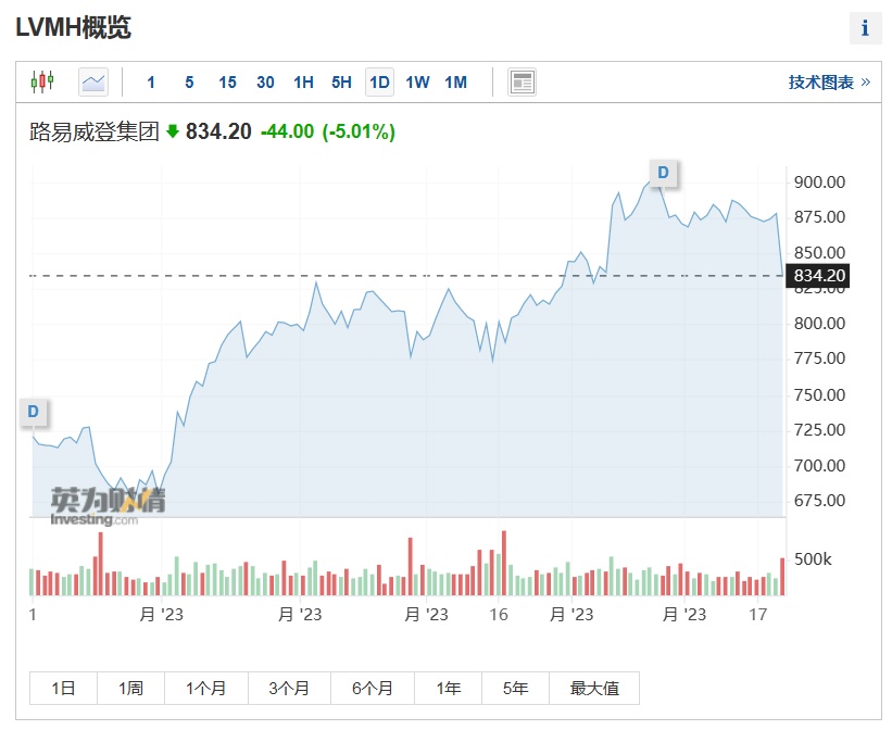 智通财经APP获悉,由于市场担心美国经济疲弱将抑制对奢侈品的需求,LV母公司、法国奢侈品巨头路易酩轩集团(LVMH)在巴黎证券交易所上市的股票周二跌逾5%,创下一年多来的最大单日跌幅。此外,欧洲奢侈品股全线下跌,市值蒸发逾300亿美元。受此影响,作为世界首富的LVMH董事长兼首席执行官贝尔纳·阿尔诺在周二这一天损失了112亿美元的身家。