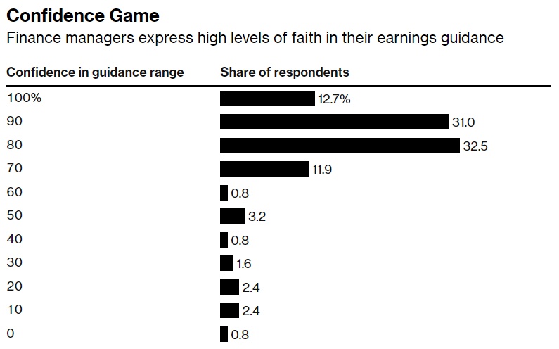 研究人员还对一些财务经理进行了深入采访,其中大多数人承认,他们发布的预期过于保守,而他们自己对收益的预期则更为乐观,通常高于预期区间的中点。这有助于解释为什么大多数收益“惊喜”都是超预期的——根据彭博社汇编的数据,历史上约有75%的收益是超预期的。