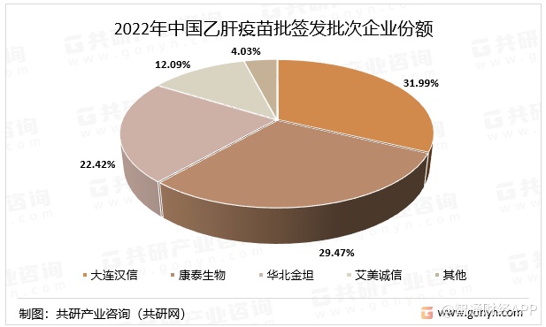 共研产业咨询数据显示,2022年中国乙肝疫苗批签发397批次,同比减少29.36%。而从乙肝疫苗批签发批次来看,大连汉信、康泰生物(300601.SZ)等企业占据主要份额,而艾美诚信仅占12.09%。