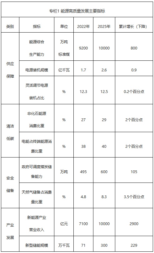 到2025年,能源高质量发展取得重大进展,能源安全保障能力大幅提升,能源绿色低碳转型成效显著,能源发展新模式新业态竞相迸发,关键核心技术自主创新实现突破,重点领域、关键环节改革取得实质性进展,协同配置资源能力有序顺畅,能源发展更有效率、更加公平、更可持续,更好地满足人民群众美好生活用能需要。多元安全的能源供应体系进一步完善,省内电力装机容量达到2.6亿千瓦,其中非化石能源发电装机占比达到44%左右。非化石能源成为能源消费增量的主体,消费比重达到29%左右。电气化水平全国领先,电能占终端能源消费比重提升至40%左右。