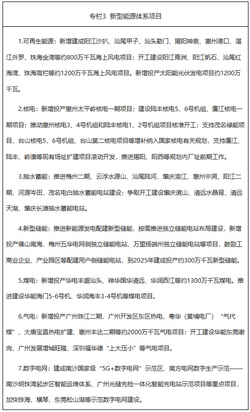 推动新能源发电项目能并尽并。统筹新能源发电、配套储能,送出工程同步规划、同步建设、同步投运。到2025年,全省可再生能源发电装机规模达到7900万千瓦。(有关市能源主管部门,广东电网公司、有关可再生能源开发企业)