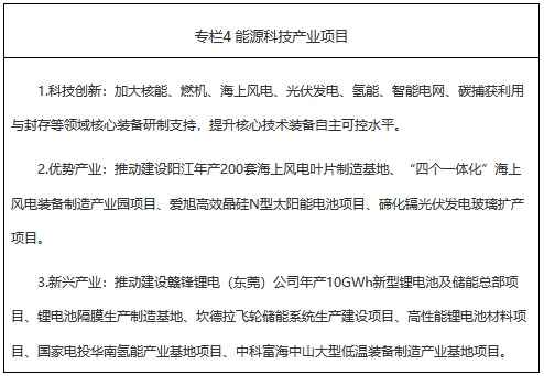 做大做强优势产业。做大做强海上风电装备制造业,加快形成集整机制造与叶片、电机、齿轮箱、轴承等关键零部件制造,以及大型钢结构、海底电缆等加工生产为一体的高端装备制造基地,提前布局海上风电运维基地。不断壮大太阳能产业,支持光伏设备、逆变器、封装、浆料等企业做大做强,重点支持高效低成本晶硅太阳能电池生产和关键设备制造,推动钙钛矿及叠层电池、柔性薄膜电池、光伏组件回收利用等先进技术研发;补强电池片等核心设备短板,提升高效电池片制造设备自主生产能力,做强光伏产业链。推进先进核能产业布局,依托惠州加速器驱动嬗变研究装置和强流重离子加速器装置、先进能源科学与技术广东省实验室、江门中微子实验站等先进科研平台,持续推进先进核能产业发展。发挥产业集聚效应,推动核技术应用产业链上下游向广东集聚,以中广核集团为龙头,构建核能研发、设计、建设、管理和运营服务完整产业链,推动深圳核电研发总部、惠州非核试验研究基地、阳江组件试验基地建设,完善广州南沙、深圳龙岗核电产业基地。依托东莞松山湖北区燃气分布式能源、中山板芙镇燃气分布式能源等项目,推动国产H-25系列燃气轮机首台套示范应用,依托东方电气南沙基地建设燃机运维中心。(省能源局、各市能源主管部门,有关企业)