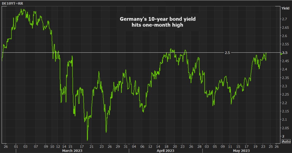智通财经APP获悉,欧元区的多国国债收益率周三升至4月底以来最高,因英国强劲的通胀数据提醒投资者,全球央行,尤其欧洲央行对抗物价上涨的斗争远未结束。其中,交易规模最大的德国10年期国债收益率飙升至2.501%,为4月24日以来的最高水平。随后小幅回吐涨幅,但仍然报2.477%。