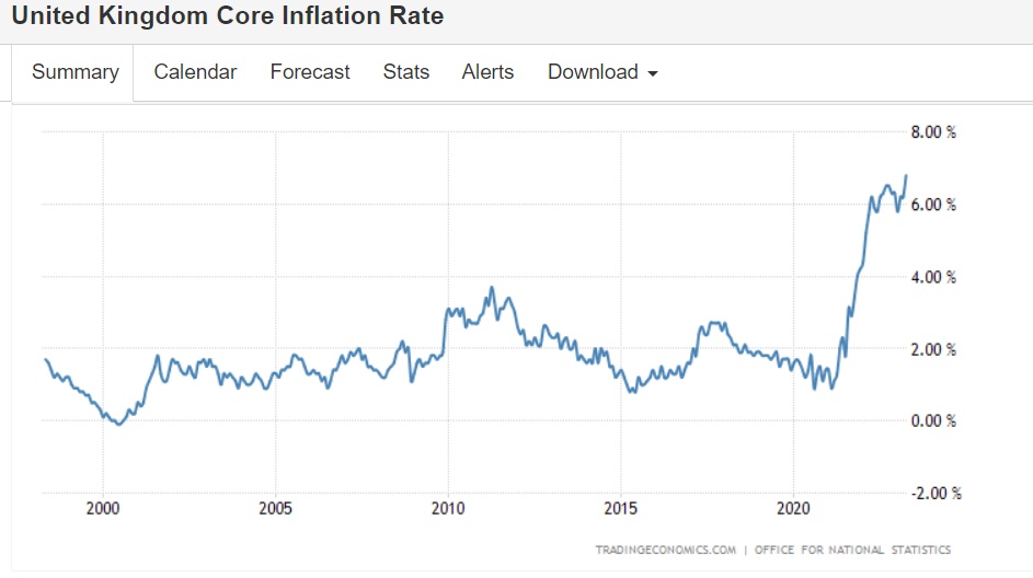 周三公布的数据显示,英国4月份物价降幅远低于市场预期,从3月份的同比增长10.1%降至8.7%,然而经济学家普遍预期为8.2%,并且仍远高于英国央行 2.0% 的目标。此外,英国剔除能源和食品的核心通胀率意外同比跃升至6.8%,这一数值为1992年3月以来的最高水平,经济学家普遍预期则为6.2%。