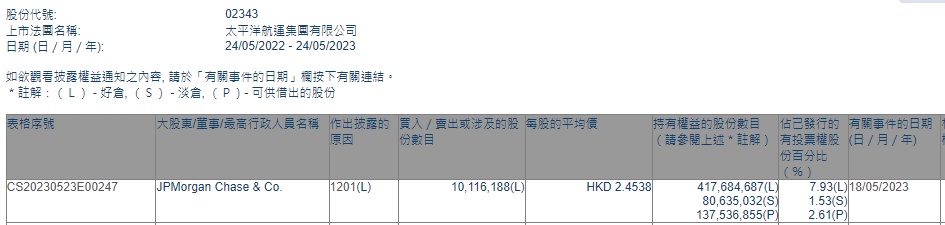 智通财经APP获悉,香港联交所最新资料显示,5月18日,小摩减持太平洋航运(02343)1011.6188万股,每股作价2.4538港元,总金额约为2482.31万港元。减持后最新持股数目约为4.18亿股,最新持股比例为7.93%。