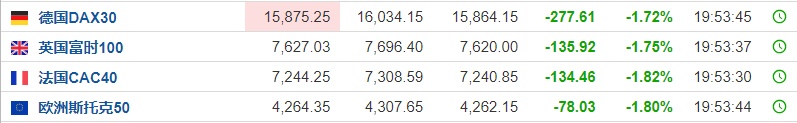 2. 截至发稿,德国DAX指数跌1.72%,英国富时100指数跌1.75%,法国CAC40指数跌1.82%,欧洲斯托克50指数跌1.80%。