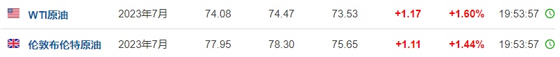 3. 截至发稿,WTI原油涨1.60%,报74.47美元/桶。布伦特原油涨1.44%,报77.95美元/桶。