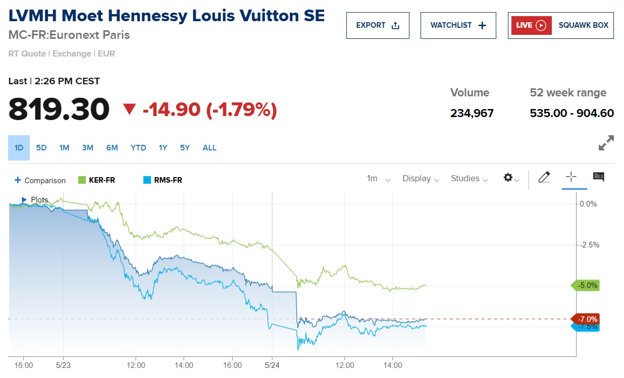 智通财经APP获悉,欧洲的两大奢侈品集团LVMH和开云集团(Kering SA)股价在欧股市场再度下跌,延续了两日里全球奢侈品行业的总计市值蒸发约560亿美元的颓势,投资者对于奢侈品行业的乐观情绪在今年强劲反弹后似乎出现下行迹象。