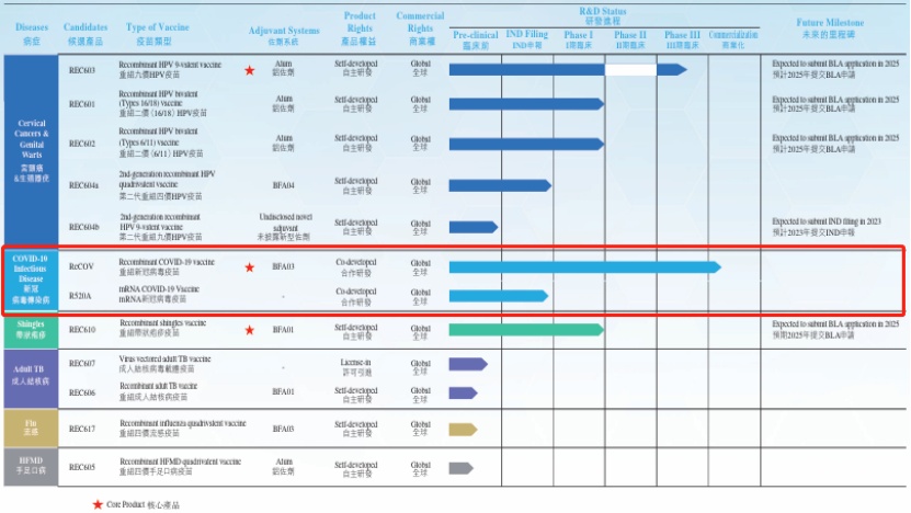 从年报中披露的最新管线研发进展来看,除了大热门的重组蛋白新冠疫苗外,九价HPV疫苗便是瑞科生物管线中商业化进展最快的产品。