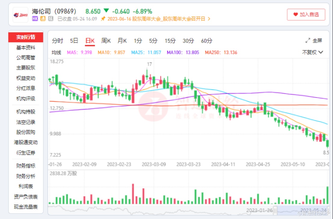 智通财经APP注意到,5月24日,海伦司股价一度下探至8.5港元,创年内新低。收盘报于8.65港元,年内跌幅达到41.63%,较25.75港元的历史高点,跌幅高达66.41%。