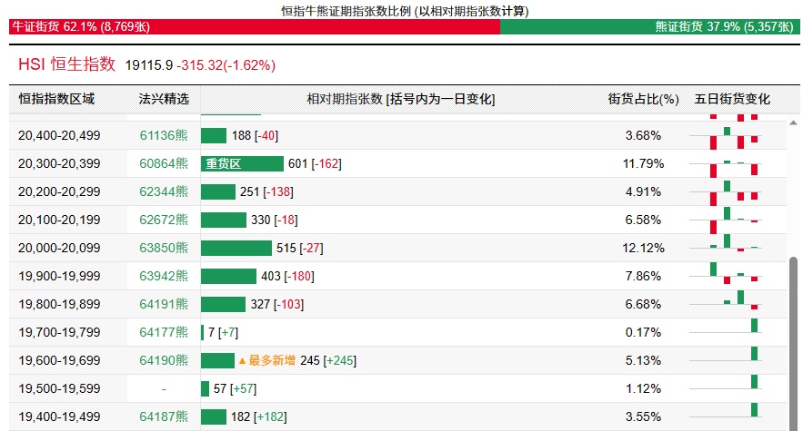 法兴恒指牛熊证街货分布图中的数据显示,熊证街货重货区在20300-20399区间,该区间最新熊证数量为601张,较上一交易日减少162张;多新增都在19600-19699区间,该区间最新熊证数量为245张,较上一交易日增加245张。
