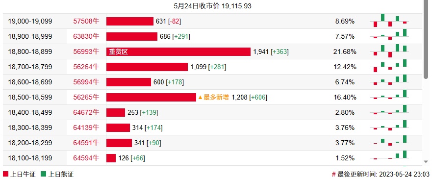 牛证街货重货区在18800-18899区间,该区间最新牛证数量为1941张,较上一交易日增加363张;最多新增在18500-18599区间,该区间较上一交易日增加606张。
