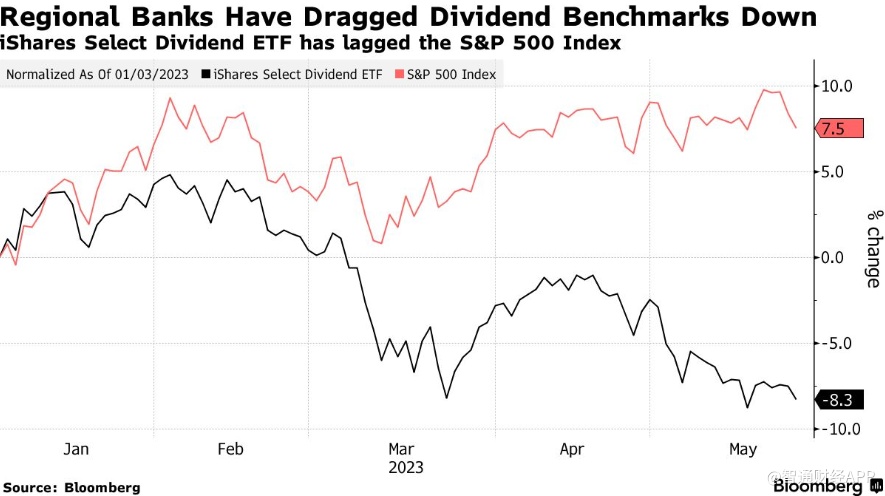 由于公用事业和金融这两个市场表现最差的板块的权重过大,股息指数ETF受到的打击尤为严重。美国地区银行的动荡导致一些成分股今年下跌了40%以上,如第一地平线国家银行(FHN.US)和KeyCorp(KEY.US)。