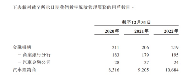 得益于优质的产品和服务,以及覆盖广泛的服务网络,长久数科数字风险管理服务的客户数量持续增加。其中,金融机构的客户数量从2020年的211名增至2022年的219名,汽车经销商客户数量从2020年的8316名增至2022年的10684名。