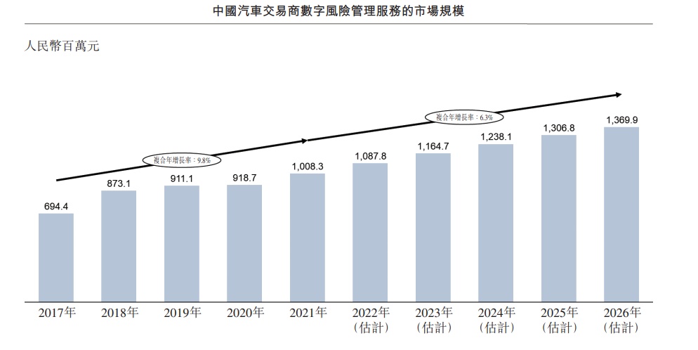 据灼识咨询数据显示,从2017年至2021年,我国数字风险管理服务的市场规模从6.94亿元增至10.08亿元,年复合增速约9.8%。随着金融机构风险管理能力的提升、运营规范化以及质押贷款渗透率的提升,该市场规模有望在2026年涨至13.7亿人民币,五年复合增速6.3%,市场需求保持稳定增长。