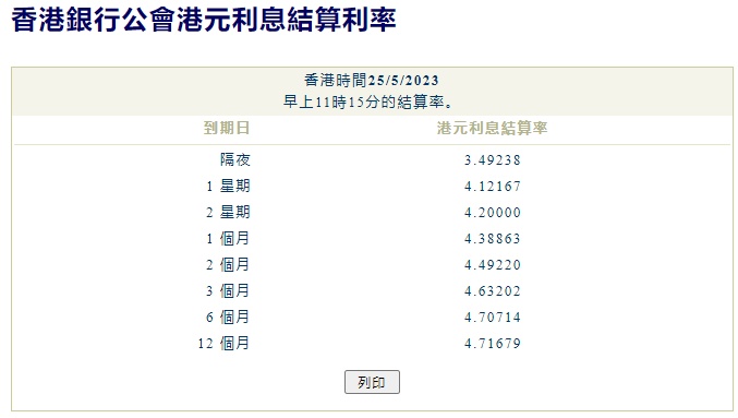 智通财经APP获悉,5月25日,港元拆息在长假期前普遍反弹。香港银行公会数据显示,隔夜息结束三连跌,从近一个月低位回升至3.49238厘;与楼按相关的一个月拆息亦微升至4.38863厘,与同期美元LIBOR息差维持75基点;反映银行资金成本的三个月拆息升至4.63202厘,与同期美元LIBOR息差维持76基点;不过,六个月及一年期拆息连跌两天。