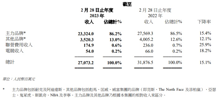 结合滔搏的财报来看,外部环境的不确定性,显然正在不断加重公司的业绩压力。拆分收入结构,报告期内滔搏来源于耐克、阿迪达斯等主力品牌的收入为233.24亿元,同比下降了15.4%;公司来源于彪马、匡威、威富集团的品牌(及范斯、The North Face及添柏岚)、亚瑟士、鬼塚虎、斯凯奇、NBA及李宁等其他品牌的收入为35.2亿元,同比下降了12.1%。
