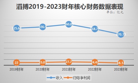 值得一提的是,若拉长时间周期来看,滔搏的核心财务数据已经连续两年大幅下滑。数据显示,2019财年-2023财年,滔搏的收入分别为325.64亿元、336.9亿元、360.09亿元、318.77亿元、270.73亿元,归母净利润分别为22亿元、23.03亿元、27.7亿元、24.47亿元、18.37亿元,增长压力不言而喻。