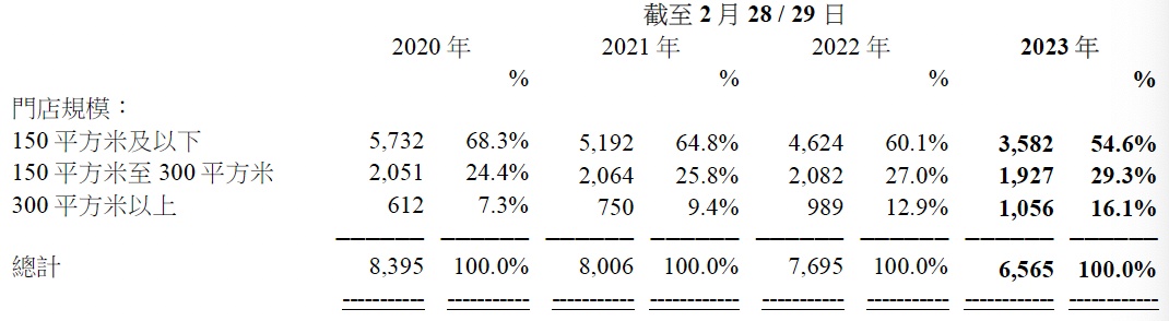 另从门店结构来看,150-300平方米以及300平方米以上的门店占比分别达到了29.3%、16.1%,较上一财年期末分别提升了2.3个pct和3.2个pct,门店面积“变大”的趋势愈发强化。