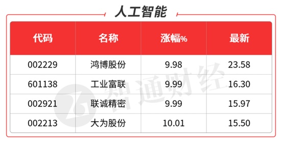 刺激市场反弹的主要是AI方向,早盘受英伟达二季度营收展望超预期的利好刺激高开,算力概念今日强势崛起,其中英伟达概念金百泽(301041.SZ)直接顶一字,20CM涨停;英伟达合作方鸿博股份(002229.SZ)、工业富联(601138.SH)回封涨停。盘中分歧有点大,还好午后获得资金回流,反复提到的CPO龙头剑桥科技(603083.SH)深水拉起,超70亿的成交额涨停,再创历史新高;天孚通信(300394.SZ)、昨天提到的中科信息(300678.SZ)均20CM涨停;金桥信息(603918.SH)7天4板,大为股份(002213.SZ)5天2板;首板有联诚精密(002921.SZ)。需注意的是,AI内部的分歧依旧较大,重点关注核心品种走势。