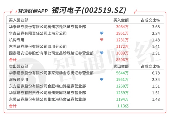 银河电子(002519.SZ):多主力现身龙虎榜,机构席位买入1231万元,买一是知名游资的席位买入3059万元,买二是量化的席位买入1939万元,买四是知名游资苏南帮的席位买入1167万元,当日卖出2009万元,该股如突破前期高点6.46元,则打开上升空间。