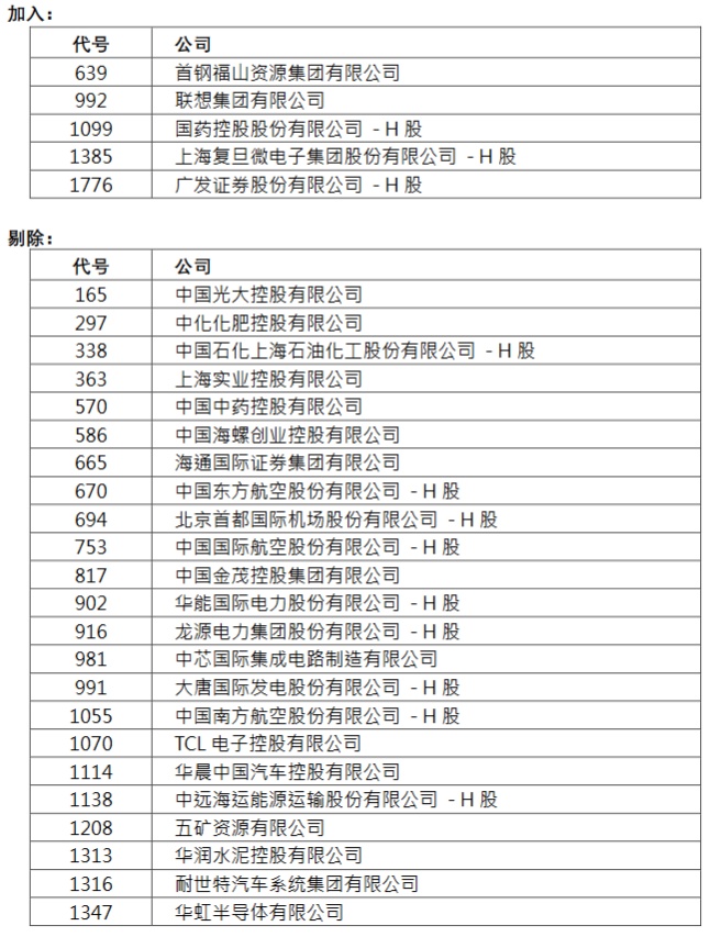 智通财经APP获悉,5月25日,恒生公司发布公告称,恒生中国国有企业指数将进行优化。新的编算方法采用于截至2023年3月31日之指数检讨,而相关的成份股变动将于2023年6月5日(星期一)生效,成份股数目将由141只减少至100只。其中,联想集团(00992)、国药控股(01099)、首钢资源(00639)、上海复旦(01385)、广发证券(01776)获加入恒生中国国有企业指数成份股,龙源电力(00916)、华润水泥控股(01313)、中国黄金国际(02099)等46只股票被剔除该指数成份股。