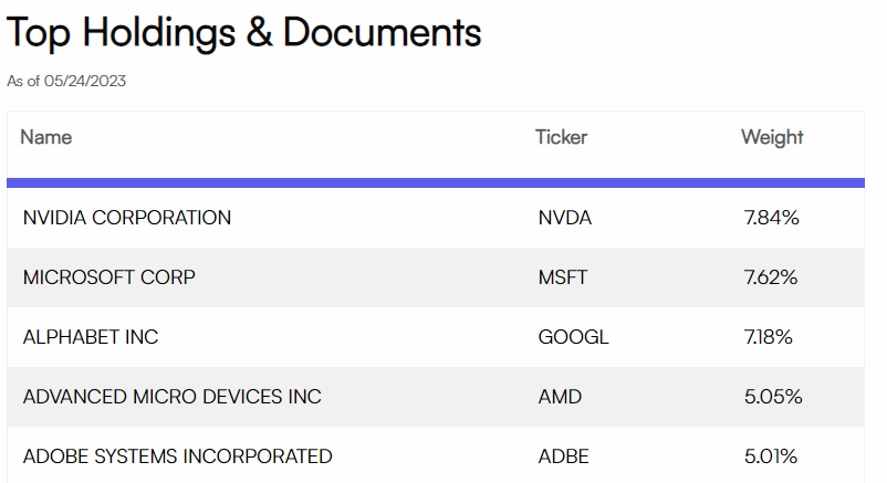 目前,该ETF已持有32家公司,其中前十大公司占持仓的56.9%。排名第一的是英伟达,微软紧随其后,第三、四位为谷歌母公司Alphabet和AMD,这些受益于AI投资狂潮的“AI科技股”今年以来的表现极其出色。