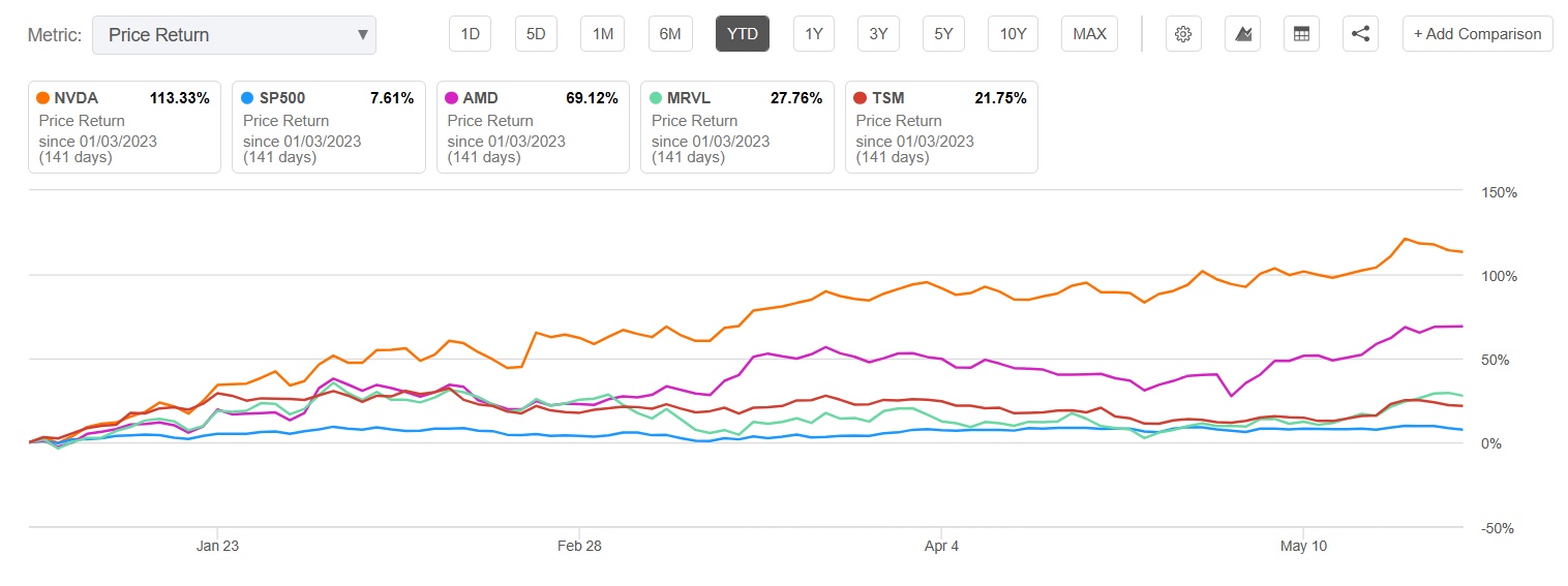 因此,从英伟达第一财季的财报和指引我们能够看出,人工智能(AI)GPU芯片在内的高性能产品需求持续暴增,这表明英伟达、AMD(AMD.US)、台积电(TSM.US)和迈威尔科技(MRVL.US)等AI硬件相关的芯片公司可能继续从ChatGPT和微软必应AI聊天机器人等火爆全球的AI软件,以及从全球布局AI的浪潮中持续受益。