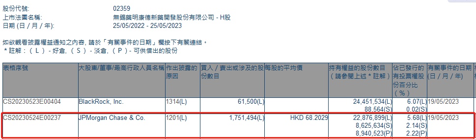 智通财经APP获悉,香港联交所最新资料显示,5月19日,小摩减持药明康德(02359)175.1494万股,每股作价68.2029港元,总金额约为1.19亿港元。减持后最新持股数目约为2287.69万股,最新持股比例为5.68%。