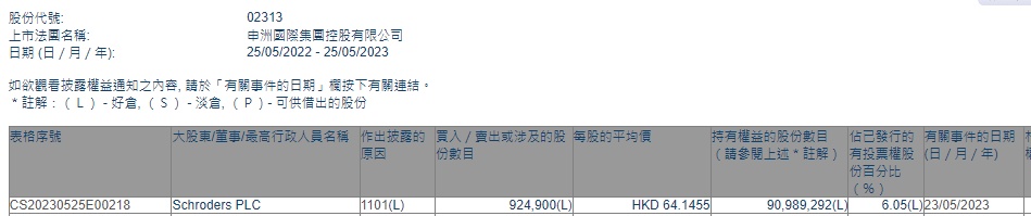 智通财经APP获悉,香港联交所最新资料显示,5月23日,Schroders PLC增持申洲国际(02313)92.49万股,每股作价64.1455港元,总金额约为5932.82万港元。增持后最新持股数目约为9098.93万股,最新持股比例为6.05%。