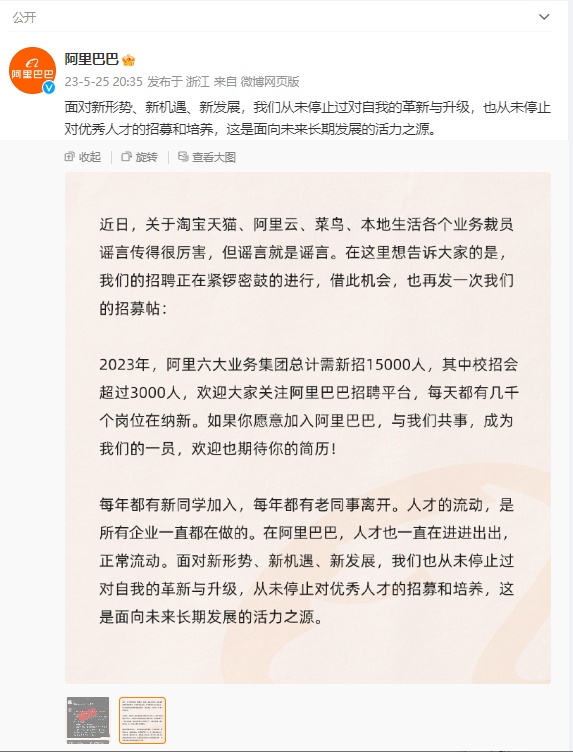 智通财经APP获悉,5月25日,阿里巴巴-SW(09988)在其官方微博上称,近日,关于淘宝天猫、阿里云、菜鸟、本地生活各个业务裁员谣言传得很厉害,但谣言就是谣言。阿里的招聘正在紧锣密鼓的进行。同时表示,2023年,阿里六大业务集团总计需新招15000人,其中校招会超过3000人,欢迎大家关注阿里巴巴招聘平台,每天都有几千个岗位在纳新。