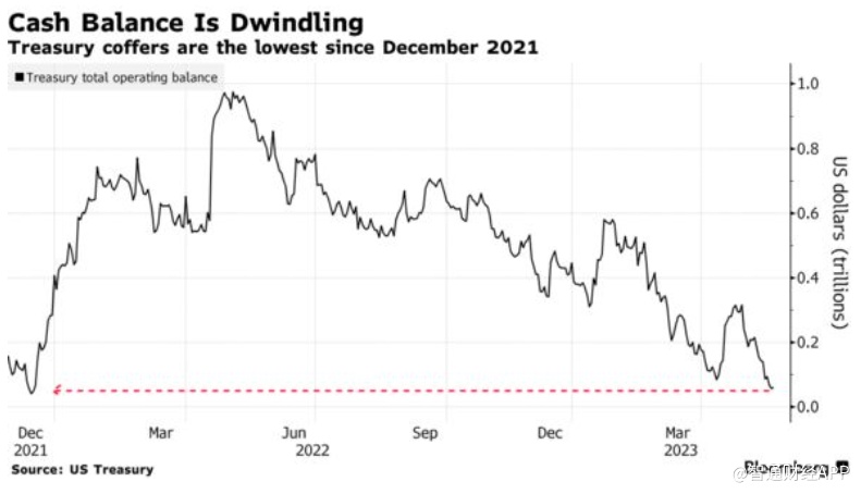 美国政府用于支付账单的资金数额跌至2021年以来的最低点,如果法定债务上限(31.4万亿美元)没有被提高或暂停,政府将面临在下月初耗尽资金的风险。