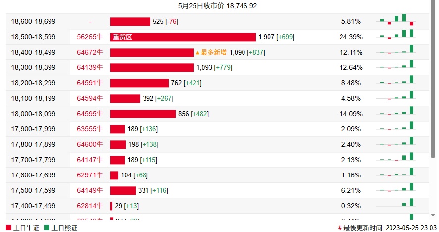 牛证街货重货区在18500-18599区间,该区间最新牛证数量为1907张,较上一交易日增加699张;最多新增在18400-18499区间,该区间较上一交易日增加837张。