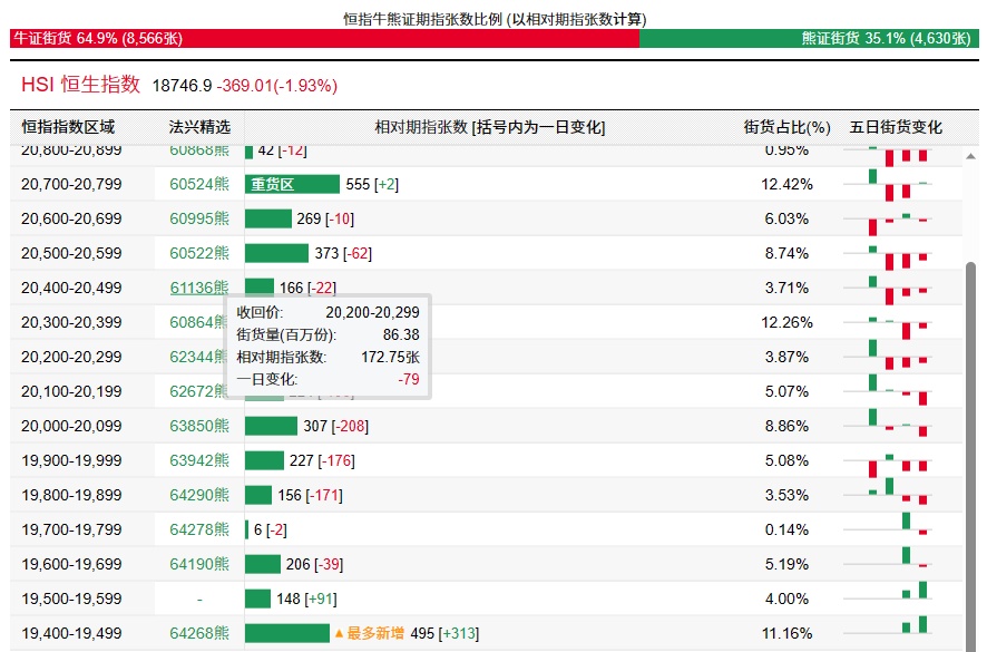 法兴恒指牛熊证街货分布图中的数据显示,熊证街货重货区在20700-20799区间,该区间最新熊证数量为555张,较上一交易日增加2张;多新增都在19400-19499区间,该区间最新熊证数量为495张,较上一交易日增加313张。