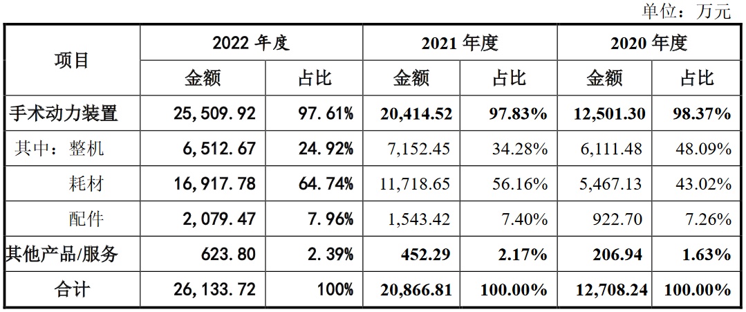 招股书披露,西山科技专注于外科手术医疗器械,特别是微创外科手术医疗器械领域,主要从事手术动力装置的研发、生产、销售,主要产品包括手术动力装置整机、耗材及配件等,目前产品主要应用于神经外科、耳鼻喉科、骨科、乳腺外科等多个临床科室。