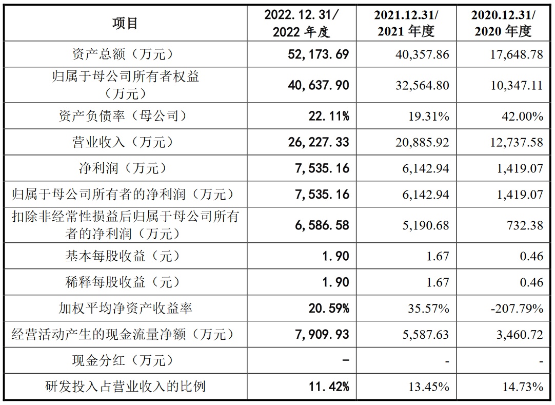 财务方面,于2020年度、2021年度及2022年度,公司实现营业收入分别约为1.27亿元、2.09亿元、2.62亿元。公司净利润分别约为1419.07万元、6142.94万元、7535.16万元人民币。