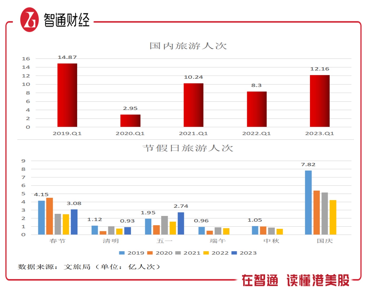根据文旅部数据,在2023年一季度,国内旅游总人次12.16亿次,同比增长46.5%,恢复至2019年的68%,五一假期旅游人次2.74亿次,同比增长70%,较2019年同期还增长40.5%。行业复苏形势大好,酒店、度假村、景区运营以及在线旅游平台等产业链参与者大都在季度中表现出色。