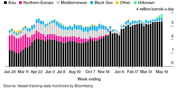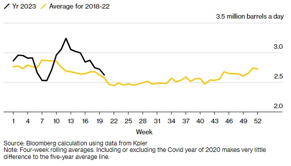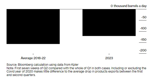 根据Kpler的数据,俄罗斯港口每周的成品油出货量已从截至3月26日一周约350万桶的峰值大幅下滑,截至5月21日当周,日产量下降了100万桶。