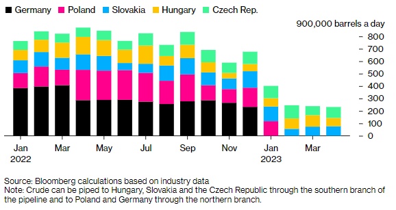 德国今年停止进口俄罗斯管道输送的原油,而对波兰的最后一次供应是在今年1月。俄罗斯输往欧洲的管道原油甚至在宣布减产之前就已改道,更不用说实施减产了。自2月份以来,管道流量一直保持稳定。