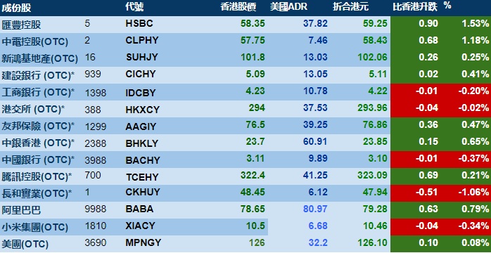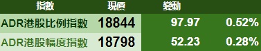 智通财经APP获悉,周五,美股三大指数上涨,港股ADR指数上涨,按比例计算,收报18844点,较香港收市涨97.97点或0.52%。