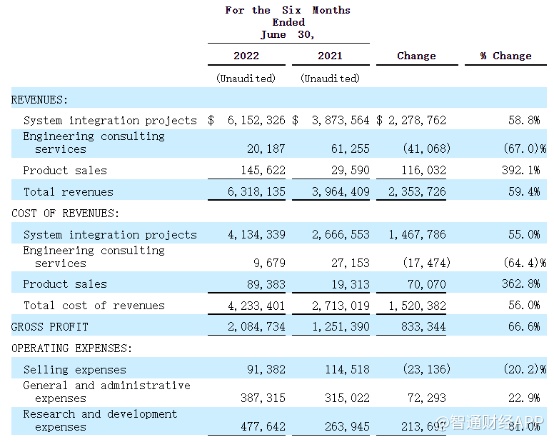 2021年全年,公司完成了93个系统集成项目,比2020年的70个项目有所增加;在截至2022年6月30日的六个月中,公司完成了89个系统集成项目,比截至2021年6月30日的六个月增加了67个项目。