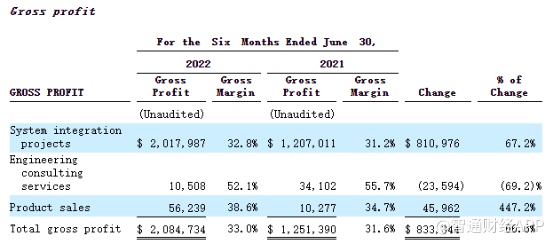 2022年上半年,工程咨询服务收入相比去年同期大幅下降67%,主要由于公司将战略重心转向系统集成项目,以致于所签订的工程咨询合同数减少。