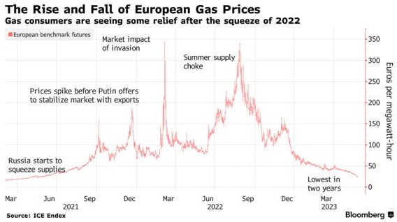 智通财经APP注意到,欧洲天然气价格已跌至2021年年中以来的最低水平,当时俄乌冲突导致供应挤压,这有助于扭转通胀飙升的趋势,并让消费者松了一口气。