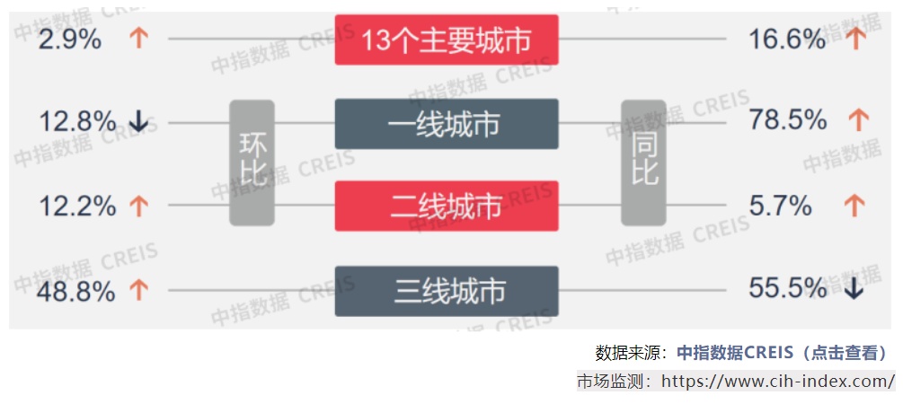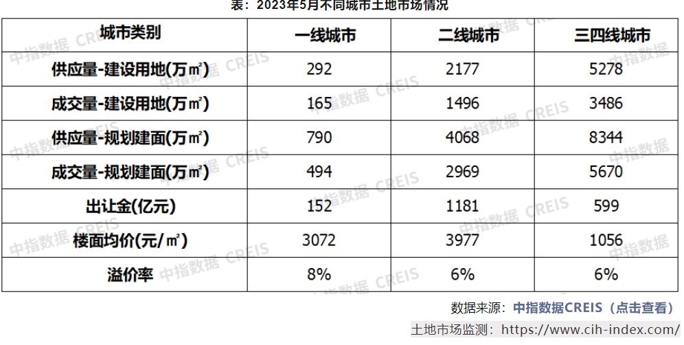 一线城市供应量同比降近四成,成交方面量价双降,出让金总额同比降逾七成;二线城市供应量同比小幅走低,出让金总额同比增逾一成,楼面均价同比增近四成;三四线城市成交量同比降逾三成,出让金总额同比降近三成,溢价率同比基本持平。