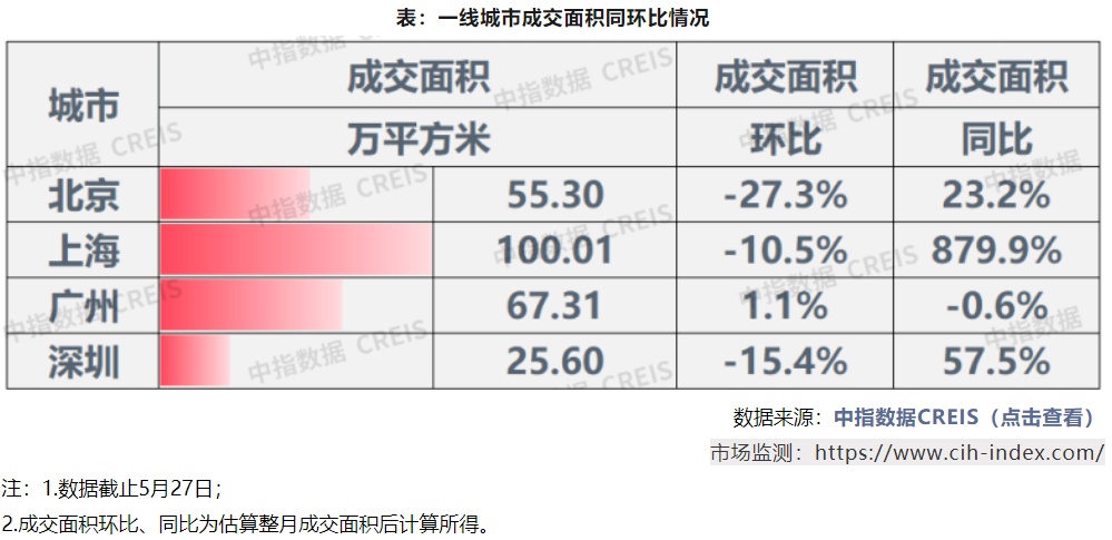 5月,一线城市成交面积整体环比下降12.8%,同比上涨78.5%。分城市来看,广州环比小幅上涨,北京、上海和广州环比均下降。同比来看,上海涨幅最大,为879.9%(去年同期疫情原因成交量较少);深圳次之,同比涨幅57.5%。